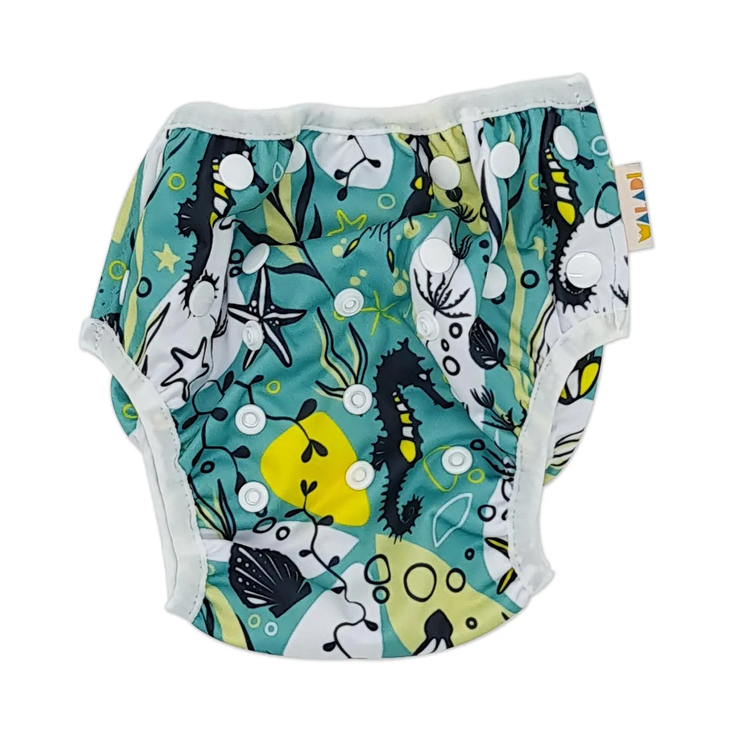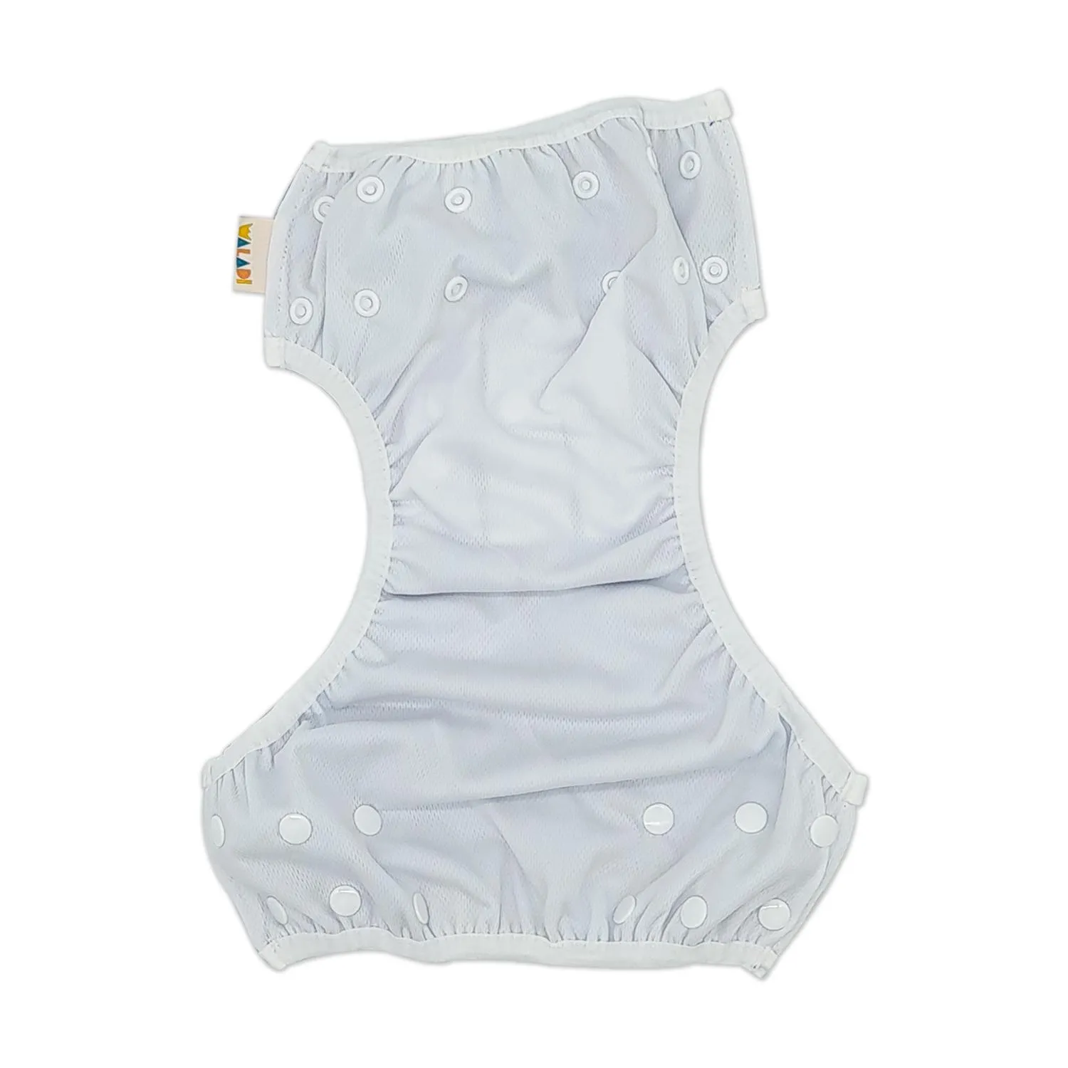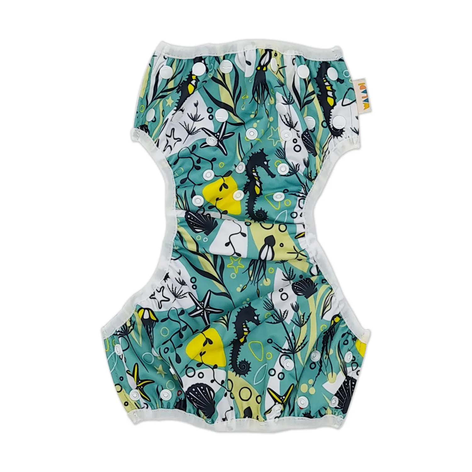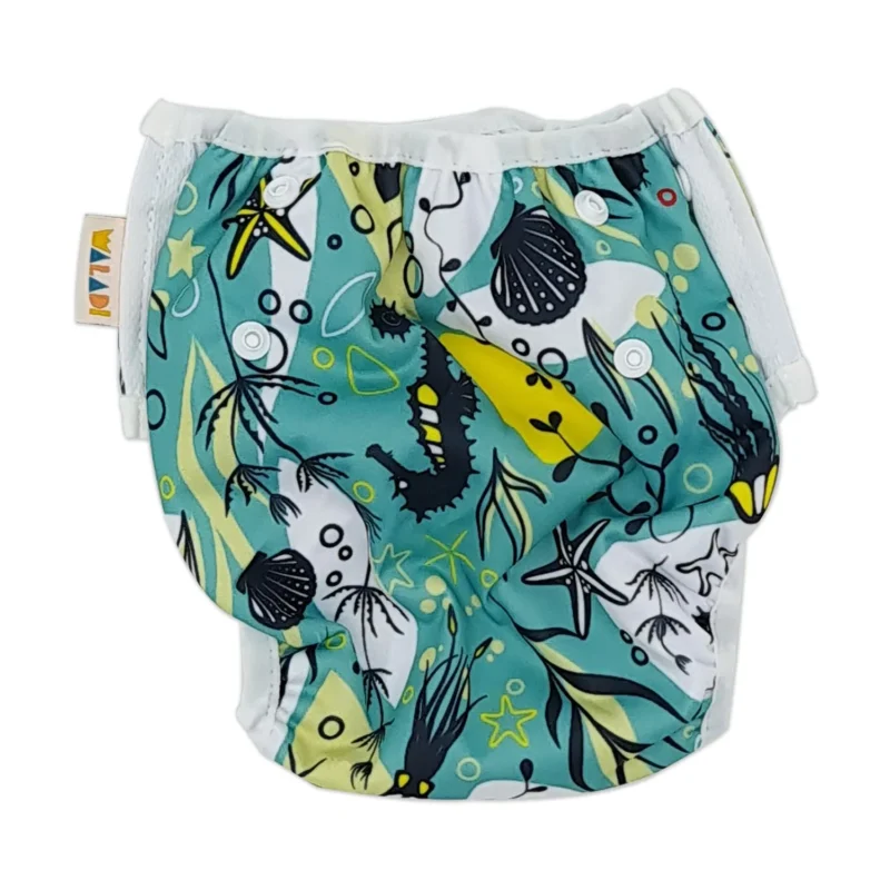 - Has a built-in system of snaps to easily adjust the size across the waistband as well as the length of the swim nappy.