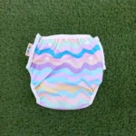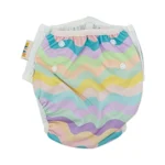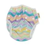 - Has a built in system of snaps to easily adjust the size across the waistband as well as the length of the swim nappy.