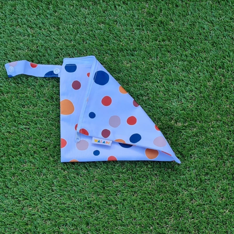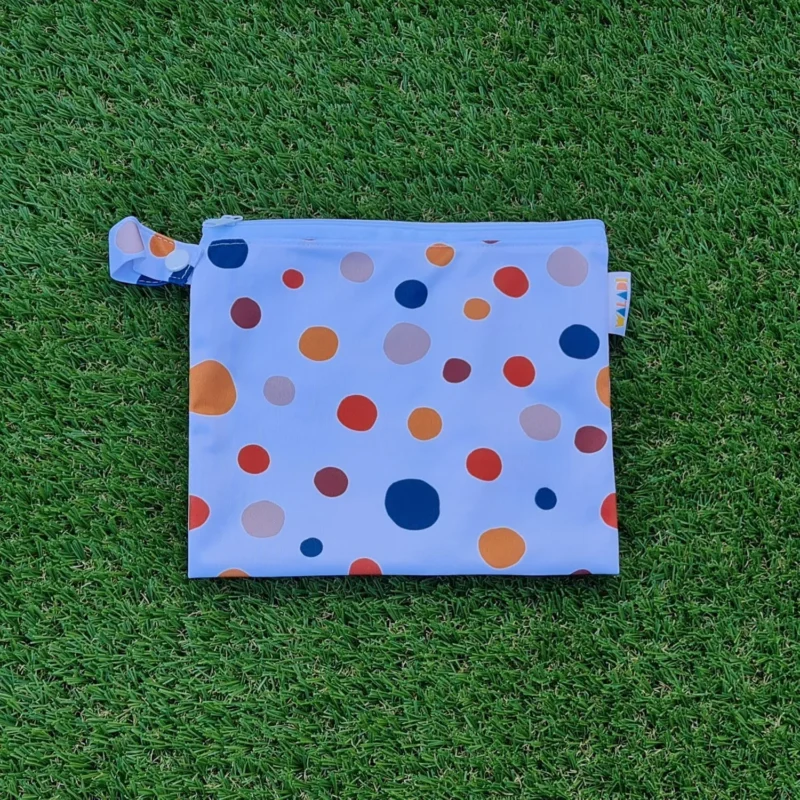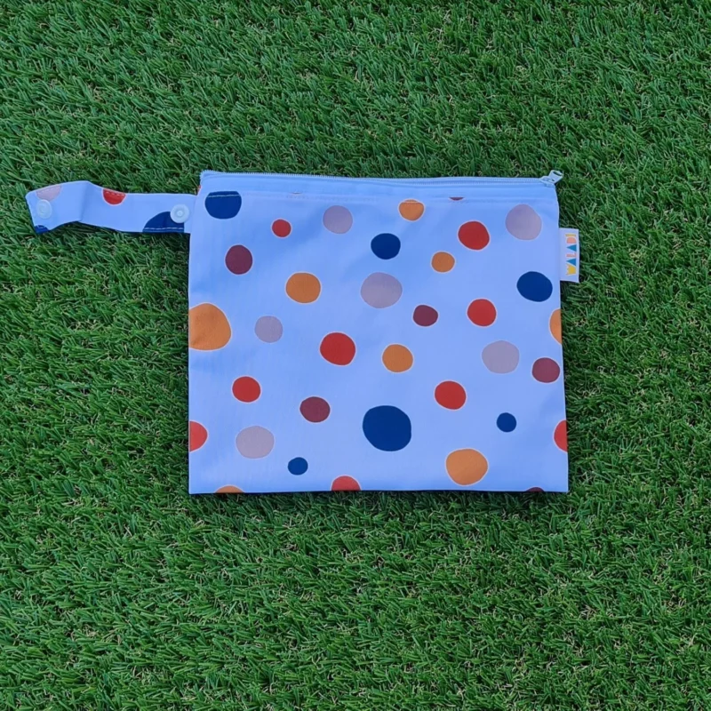 A wet bag is essential for any diaper bag. Some parents use it solely as a diaper bag! It holds soiled clothing, cloth diapers, wet swimsuits, toys, wet wipes, snacks, sippy cups, bottles, toiletries, potting training supplies…the possibilities are endless! Our wet bags are machine washable and dryer safe! We recommend low settings for both.