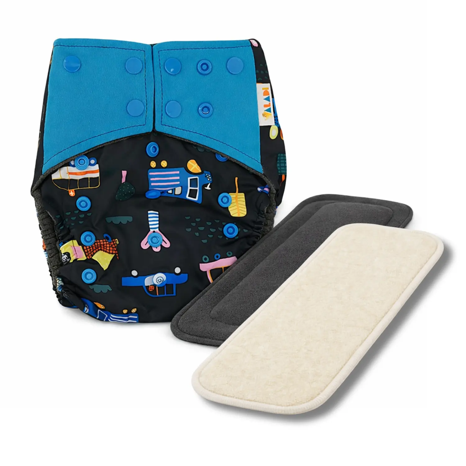 Vehicles Cloth Nappy with Inserts – Overnight Set is a complete, ready-to-use solution designed for longer wear, overnight use, and heavy wetters. Each set includes a reusable pocket nappy paired with a 5-layer charcoal bamboo insert and a 4-layer hemp insert, giving you higher absorbency compared to standard daytime setups.